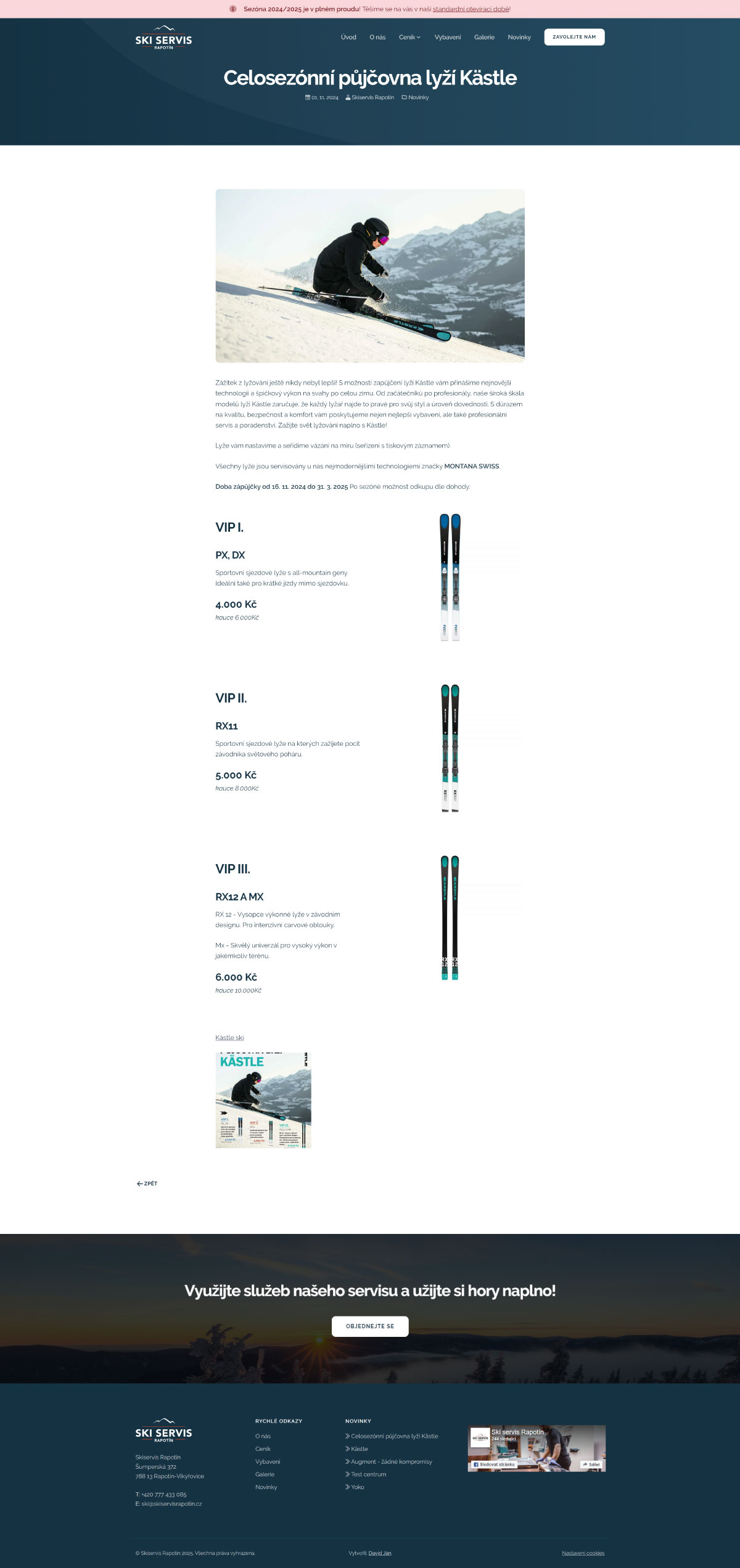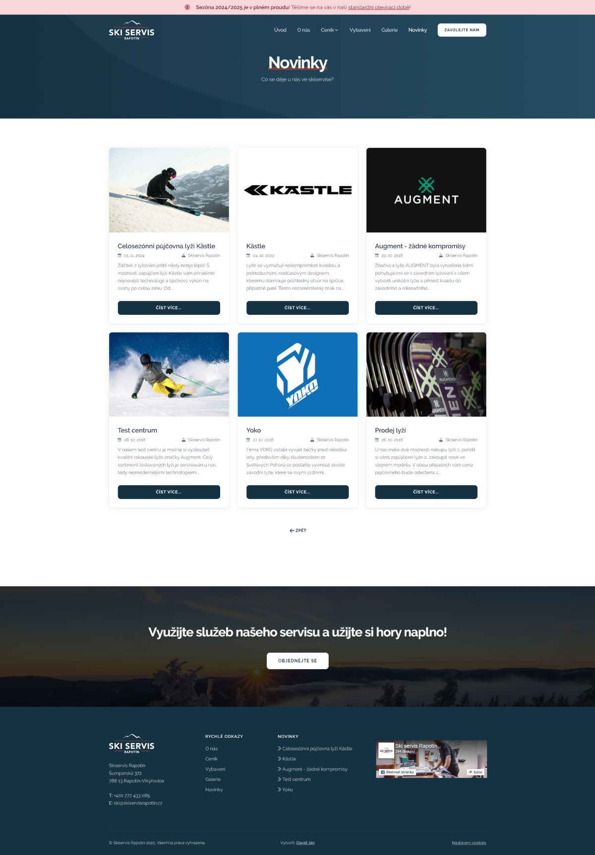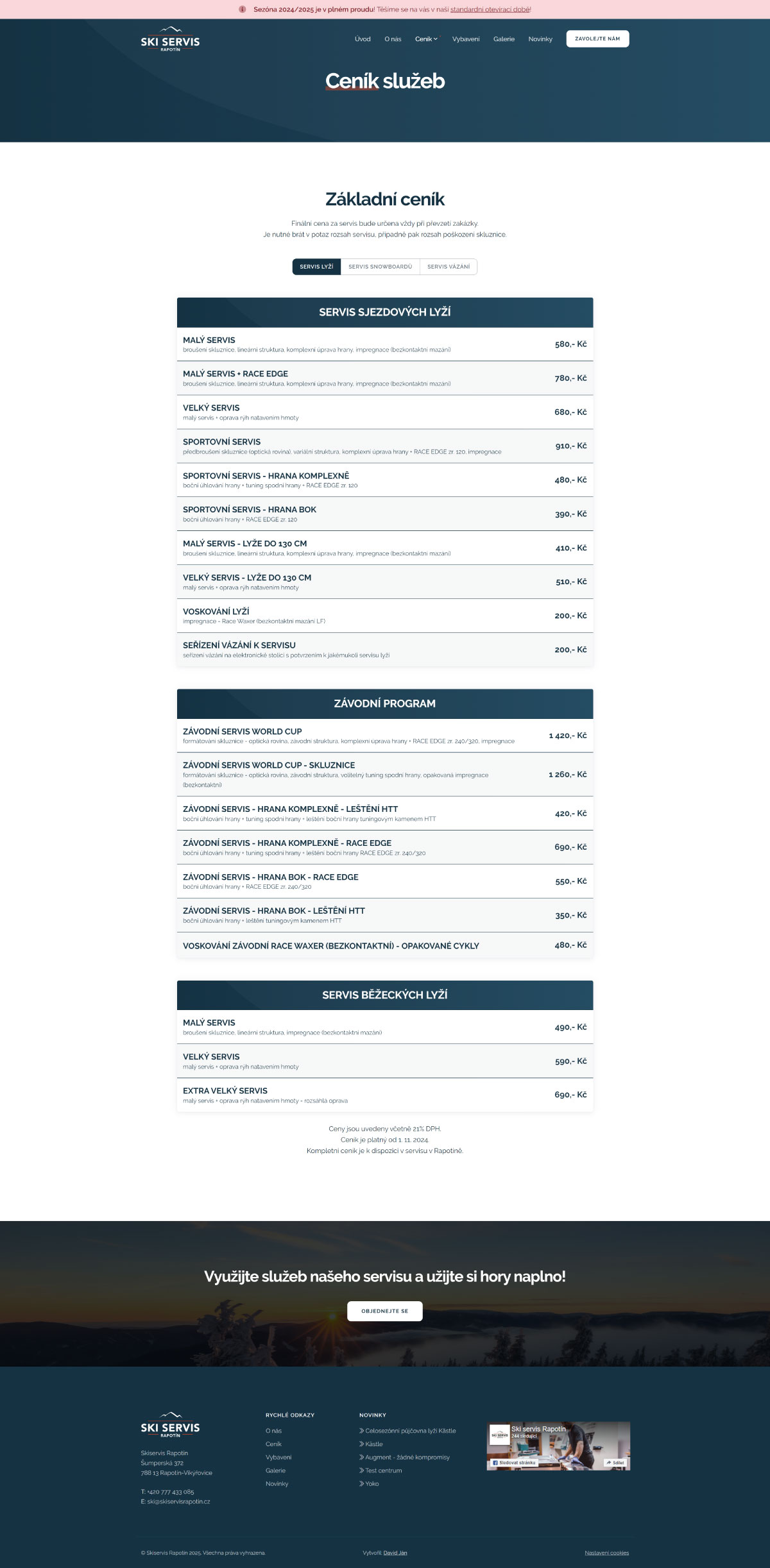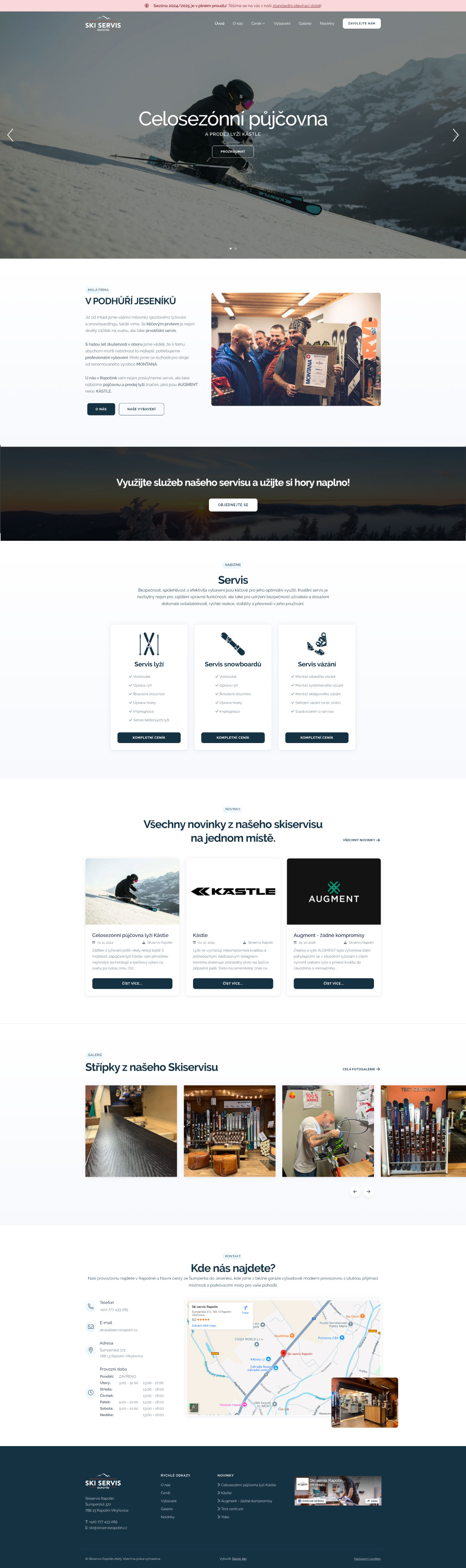 Jednoduchý a přehledný web pro Ski Servis Rapotín. Cílem bylo vytvořit funkční prezentaci služeb s důrazem na rychlou orientaci, přehledný ceník a aktuální informace o provozu servisu. Web umožňuje zákazníkům snadno zjistit dostupnost i způsob kontaktu. Důraz jsem kladl na čistý vzhled, srozumitelnost a snadnou správu obsahu.